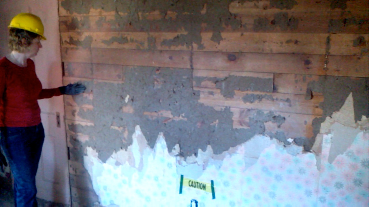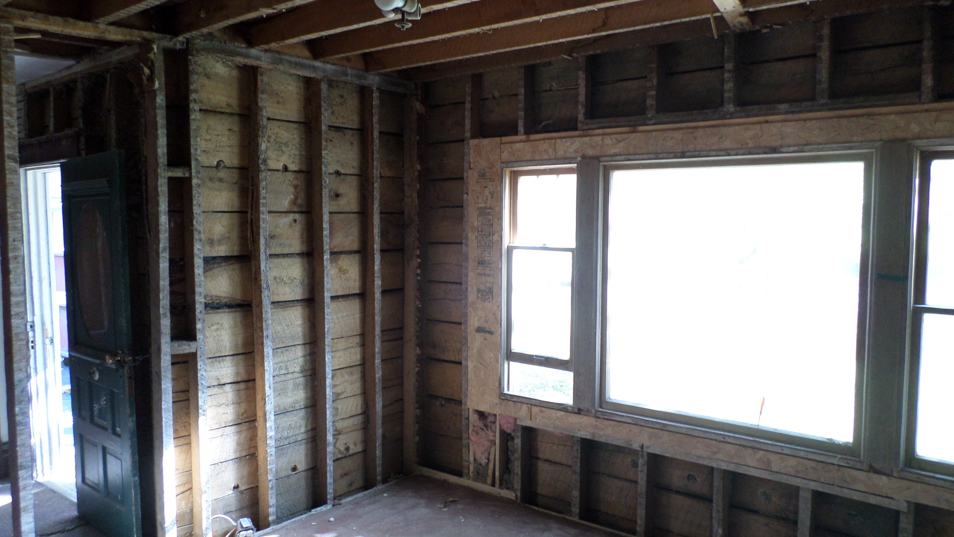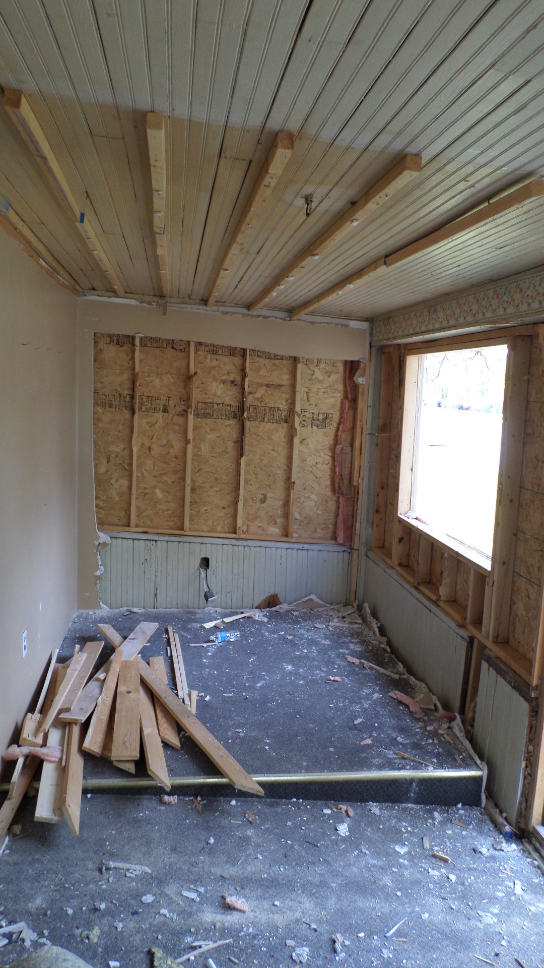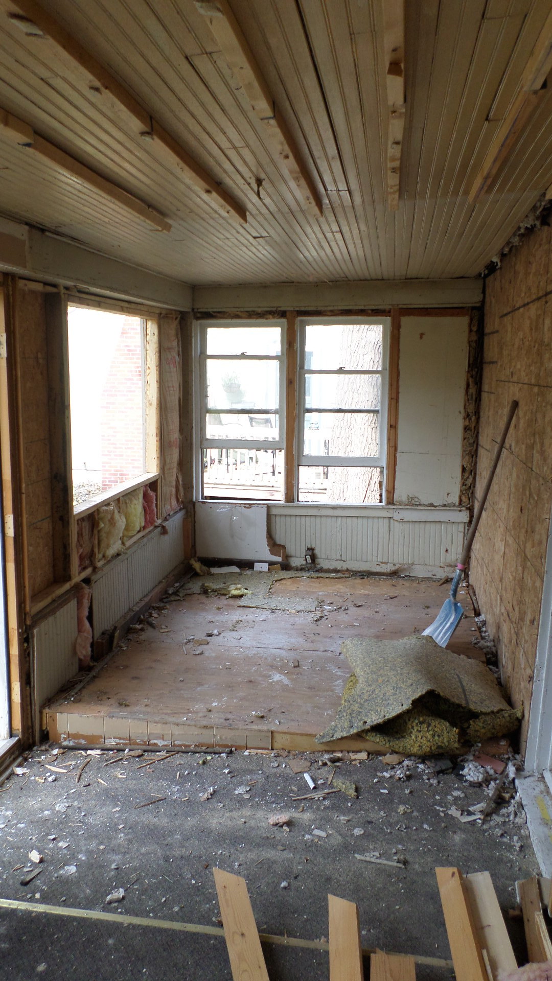 Old mudroom in process of being gutted.This section of the porch used to be part of the bedroom. Reconstructed wall visible on right-hand side.