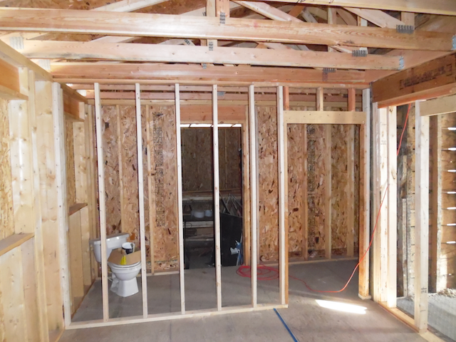 The layout of the downstairs is fully framed. The powder room and breezeway have walls.