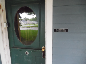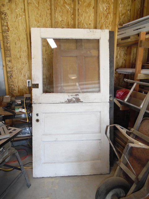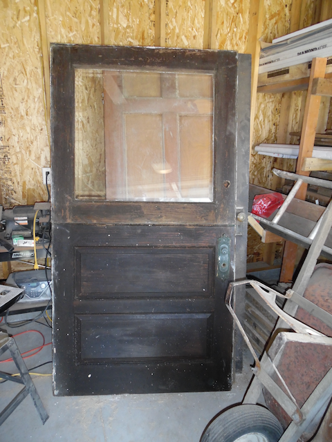 Since the porch will get a Dutch theme, a dutch door was purchased. The characteristic of a dutch door, is that the top can be opened without opening the bottom part of the door. It is a massive door (42-inch wide) and a bit bland in comparison to the south-side porch door. The plan is to modify the door during the next trip up there. Here are the pictures of the door as it is today.